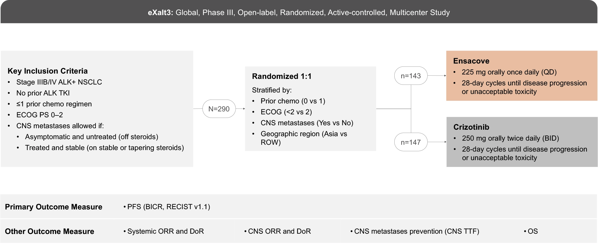 The eXalt3 study evaluated efficacy and safety in patients with ALK+ locally advanced or metastatic NSCLC who had not previously received an ALK TKI.1