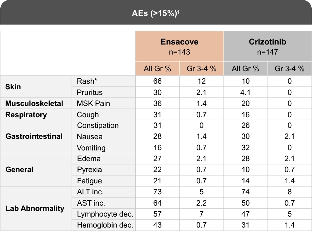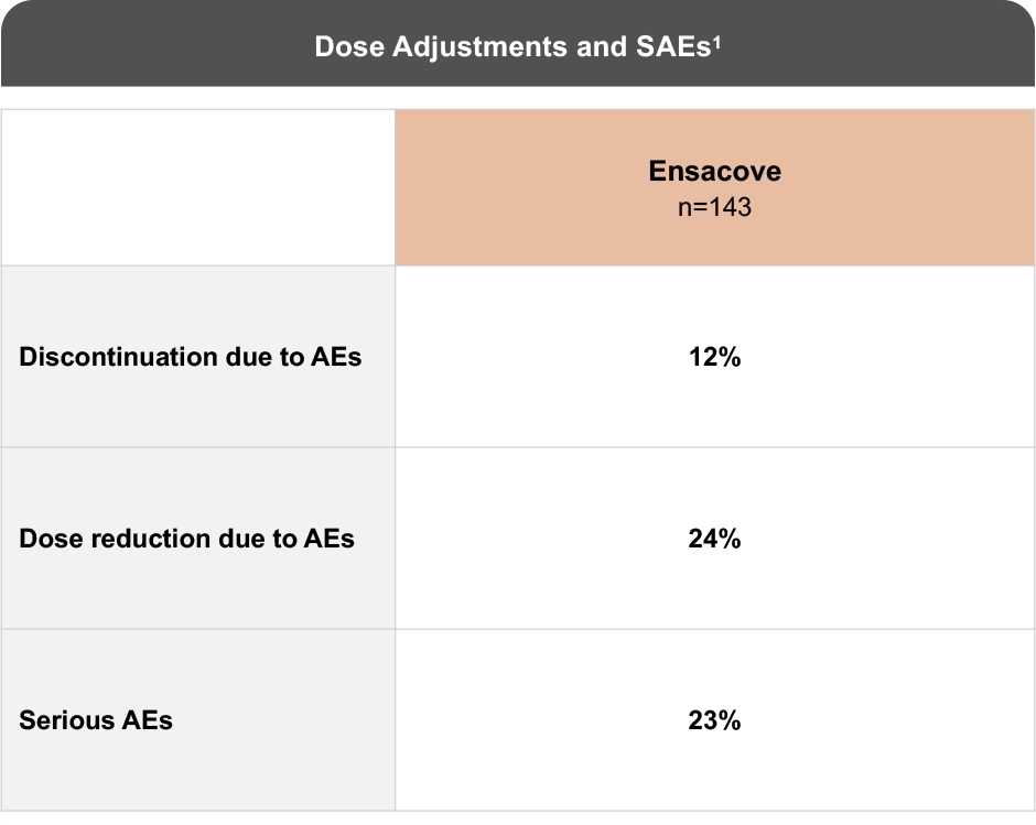 - Adverse reactions which resulted in permanent discontinuation of ENSACOVE (≥1%) included increased ALT (2.1%), increased AST (2.1%), pneumonitis/ILD (2.1%), increased blood bilirubin (1.4%), and increased conjugated bilirubin (1.4%)1